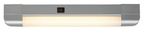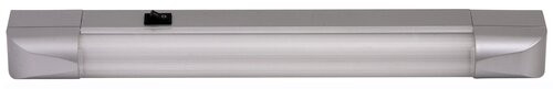 Modern megjelenésű fürdőszobai vagy pultmegvilágító lámpa. 1 darab energiatakarékos fénycsővel csomagolt, amely 10W-os, 630 lumen fényerejű, 2700 Kelvines, azaz melegfehér fényű. 35 mm magas, 395 mm széles fém és műanyag lámpatest ezüst műanyag búrával. Kapcsolós, egyszerűen kezelhető. A lámpa G13-as foglalattal készült, 1 darab T8-as típusú, maximum 10W teljesítményű fényforrással használható.