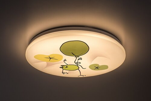 A Rábalux Froggo gyerek mennyezeti lámpa a Rábalux saját tervezésű modellje. Ideális választás azoknak, akik hosszú élettartammal bíró, színes LED mennyezeti lámpát keresnek a gyerekszobába. A lámpa kerek formával, fém testtel és mintás műanyag búrával készül. A fehér búrát mókás békás-lufis motívum díszíti, amely garantáltan mindig jó kedvre deríti a szoba lakóját. A minta meghatározó színei a zöld és a sárga, amely frissességével, vidámságával telitalálat bármely gyerekkuckóba. A gyerek lámpa beépített LED fényforrással rendelkezik, amely meleg fehér fénnyel világít, kellemes, otthonos hangulatot árasztva. A LED technológiának köszönhetően a gyerekszoba lámpát energiahatékony működés és kivételesen hosszú élettartam jellemzi.