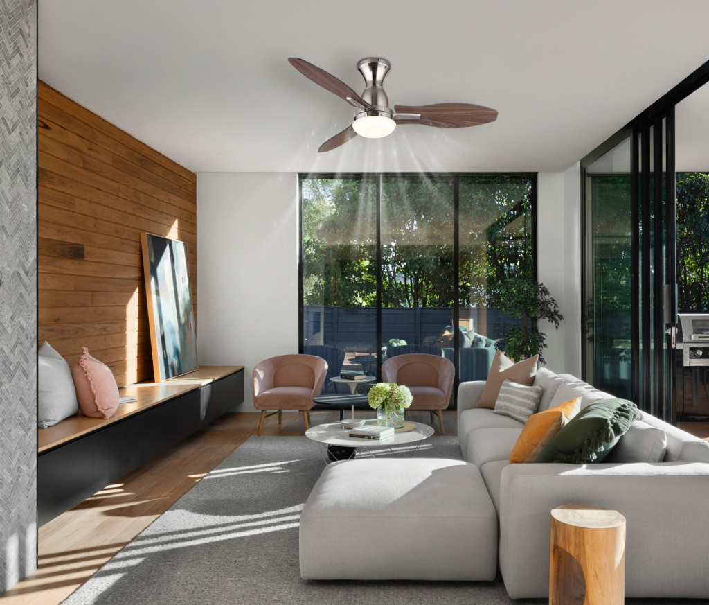 Mennyezeti ventilátor fém nikkel,műanyag fehér/fa megjelenésű sötét/világos, több fokozat,színrögzítés, memória,távirányító, 25m²-re,hűtés/fűtés, 80/120/150/180/210/230 RPM, ø:1070mm, M:350mm,LED 22W 230V, 2570lm forrás,1897lm kimenet,3000/4200/6000K