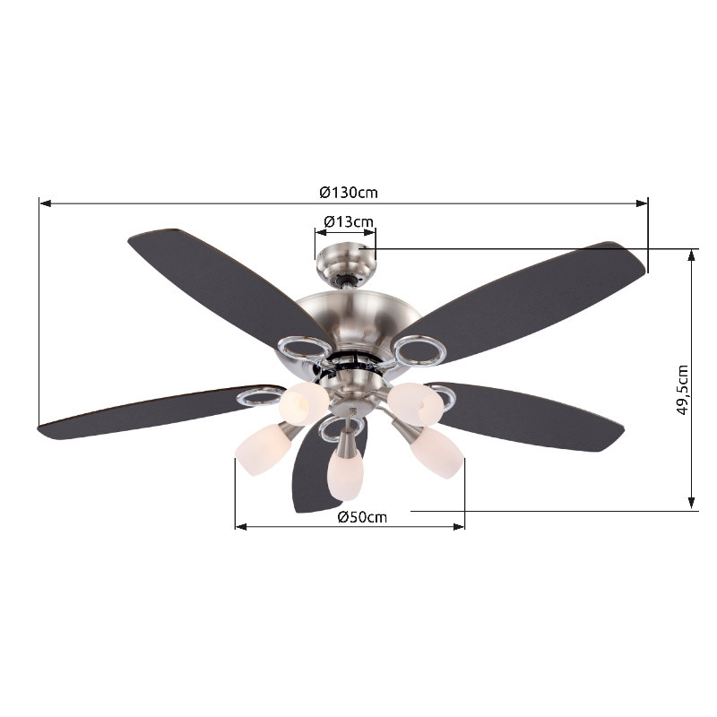 Mennyezeti ventilátor szatén róm test, grafitszürke,bükk MDF lapát ,üveg búra, 5X40W E14, 50Hz, 3 fokozatú, 2 irányú forgás, láncos húzókapcsolóval