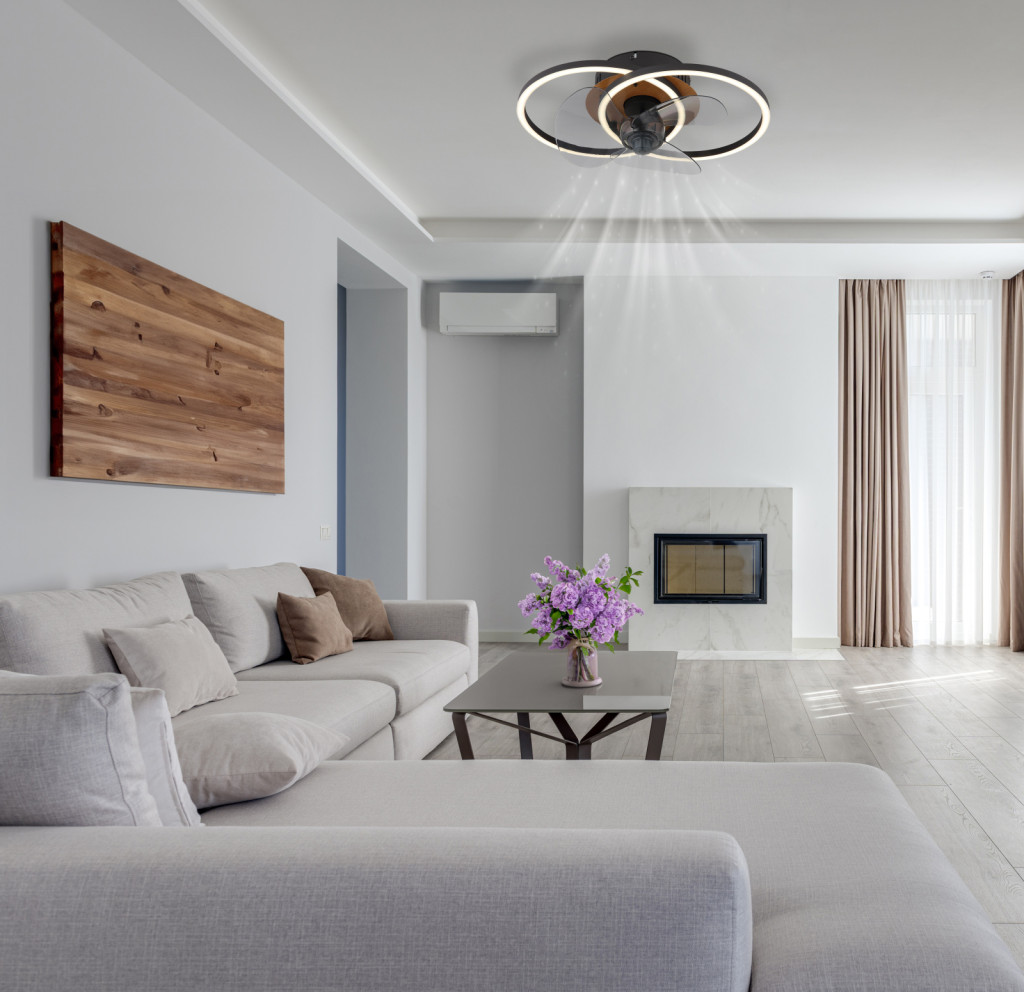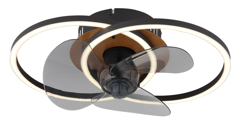 Mennyezeti ventilátor fém fekete/fa mintázatú, műanyag fehér/füstszínű, dimmelhető, több fokozat fali kapcsolóval,memória, távirányító, 20m²-re, HxSzxM:420x280x144mm, lapát ø:28 cm, LED 24W 230V, 150-2800lm forrás, 28-490lm kimenet, CCT 2700-6500K