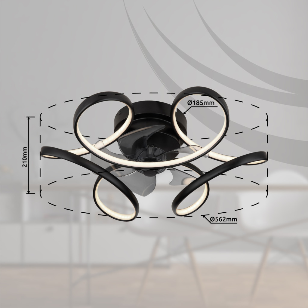 Mennyezeti ventilátor fém fekete matt, akril fehér, műanyag átlátszó, dimmelhető, több fokozat fali kapcsolóval, memória, időzítő, távirányító, 25m²-re, ø: 560mm, M: 210mm, tartozék:LED 30W 230V, 400-4000lm forrás, 220-2200lm kimenet, CCT 3000-6000K