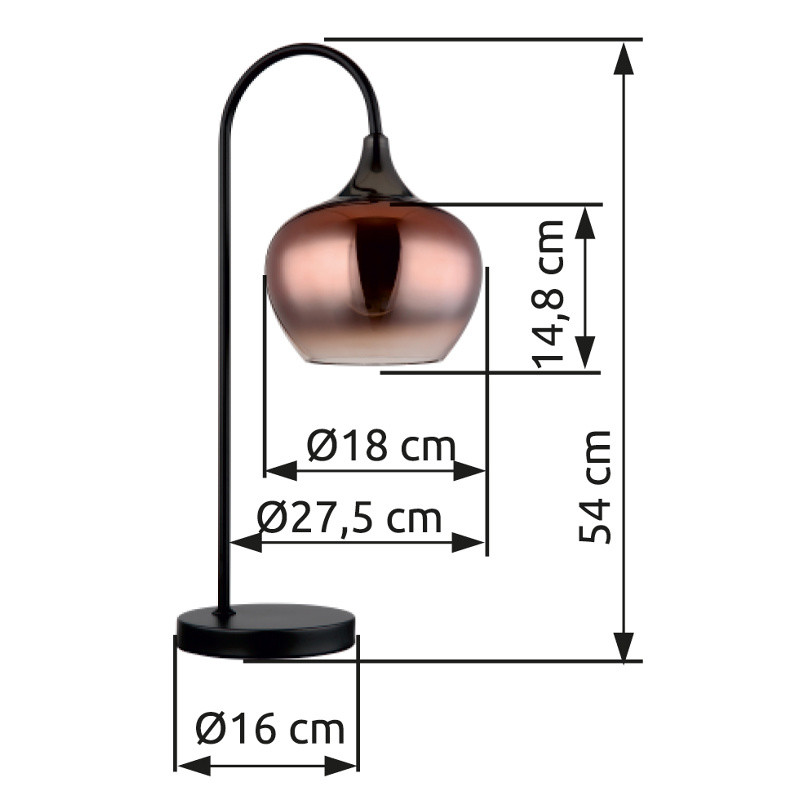 Asztali lámpa fém fekete matt, fém fekete-króm, réz színű/átlátszó színátmenetes üveg búra, fekete textil kábel, billenőkapcsoló a kábelen, HxSzxM: 275x160x540mm, kábel hossza 1500mm, 1x E27 40W 230V izzó nélkül