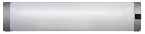 Modern megjelenésű fürdőszobai vagy pultmegvilágító lámpa. 1 darab energiatakarékos fénycsővel csomagolt, amely 10W-os, 630 lumen fényerejű, 2700 Kelvines, azaz melegfehér fényű. 90 mm magas, 410 mm széles fém és műanyag lámpatest ezüst színű műanyag búrával. Kapcsolós, egyszerű kezelhető. Az IP20-as védettségű lámpa G13-as foglalattal készült, 1 darab T8-as típusú, maximum 10W teljesítményű fényforrással használható.