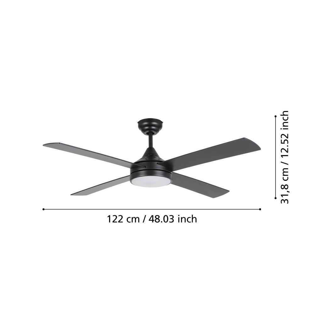 A LED lámpás TRINIDAD mennyezeti ventilátor fémből készült, matt fekete bevonattal és négy MDF lapáttal rendelkezik, amelyek megfordíthatók, így akár a fekete, akár a tölgy színű oldala látható. A tejfehér akril burkolat alatti integrált LED-ek kellemes testreszabható fényt adnak, amely a mellékelt távirányítóval vezérelhető és három fényerőszintre állítható. Választhat meleg fehér, semleges fehér és hideg fehér fény között. A távirányító lehetővé teszi a három sebességbeállítás egyikének kiválasztását, az időzítő működtetését, valamint a nyári és téli üzemmódok közötti váltást. A forgásirány megfordítható (nyári és téli üzemmód), így a ventilátor egész évben használatos a helyiség kellemes hőmérsékleten tartása érdekében. Ez a klasszikus mennyezeti ventilátor beépített váltóáramú motorral és 3,64 (m³/perc)/W légáramlás-teljesítmény arányú. A mennyezeti ventilátor 122 cm átmérőjű, és ideális 20 és 27 m2 közötti helyiségekbe. A termék akár 13°-os dőlésszögű mennyezetre is felszerelhető.